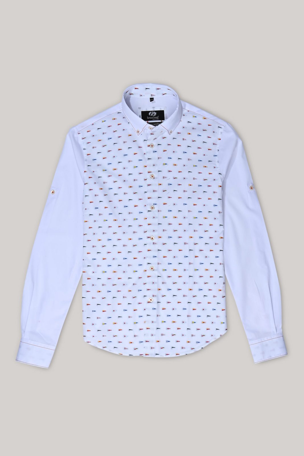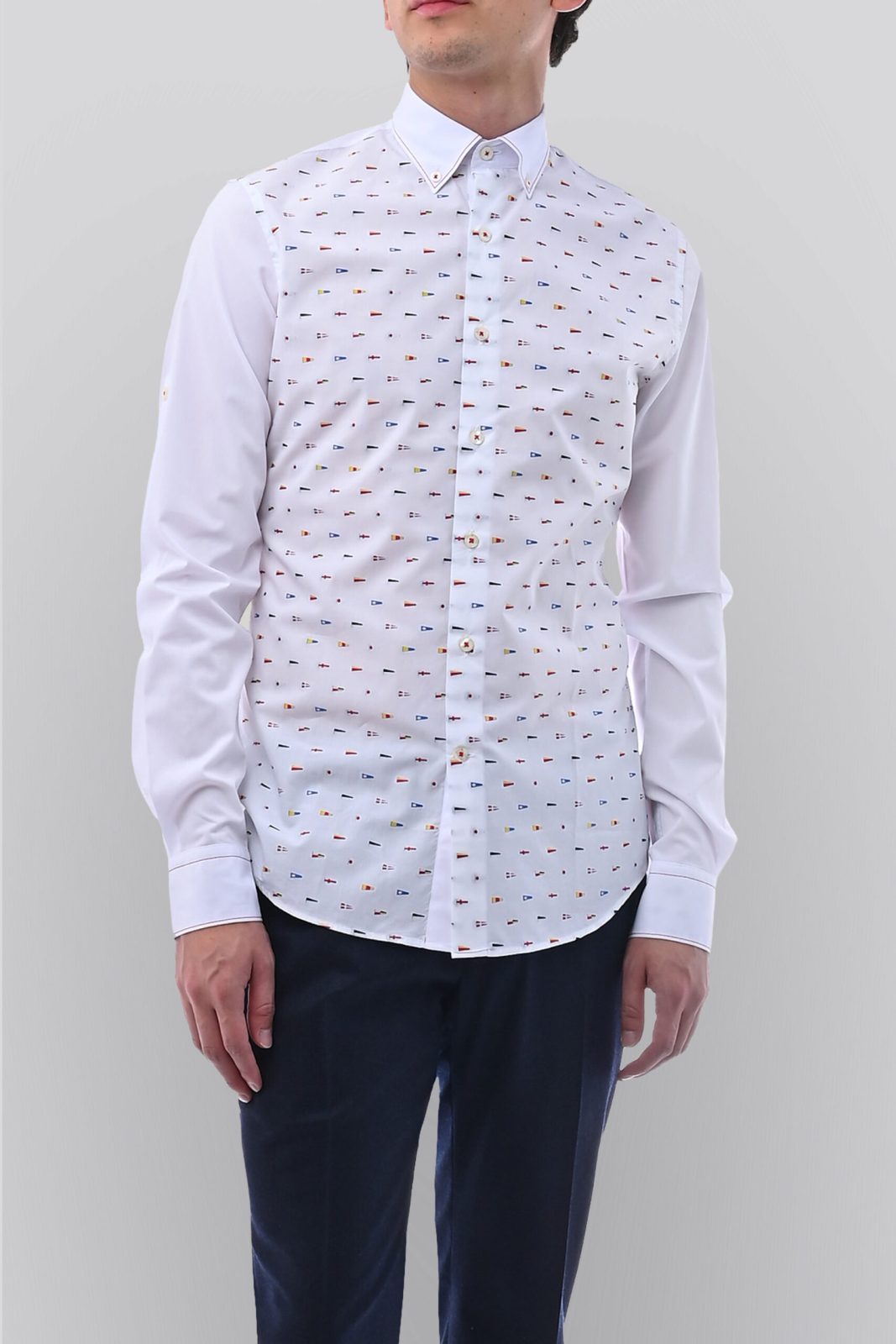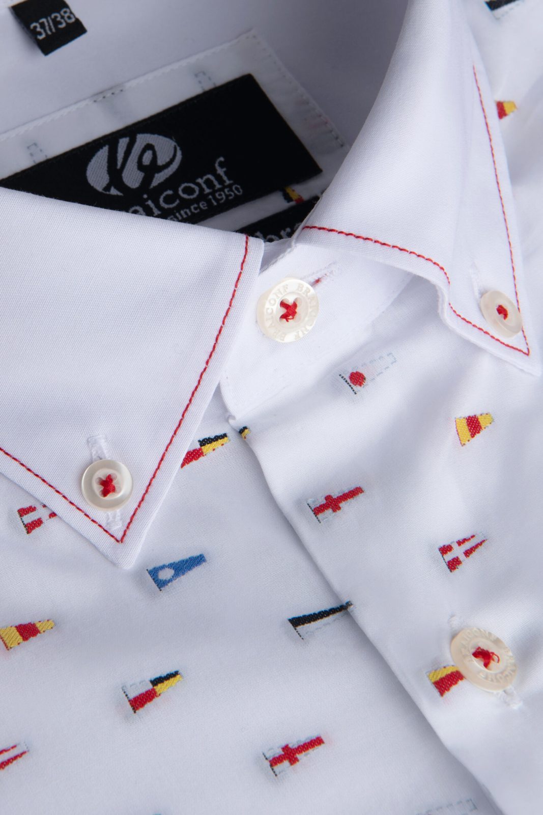 Camasa casual extracambrata, cu guler cu nasturi, cu piepti din tesatura speciala cu motive vesele discrete, cu maneci a caror lungime se ajusteaza, cu detalii de garnitura la interiorul gulerului si mansetelor, dar si cusaturi decorative in contrast la guler, mansete, umeri si spate.