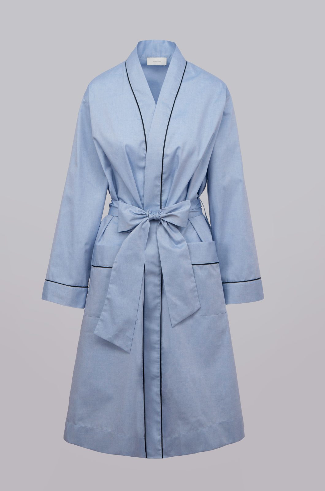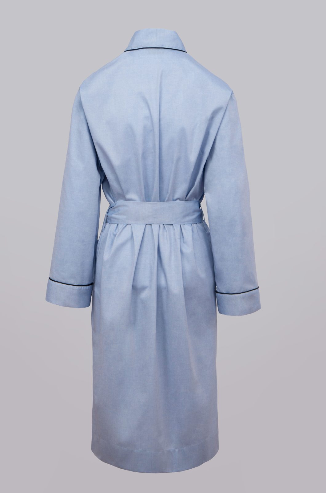Halat de casă lung din bumbac 100%, bleu cu detalii negre și cordon in talie pentru ajustare.
