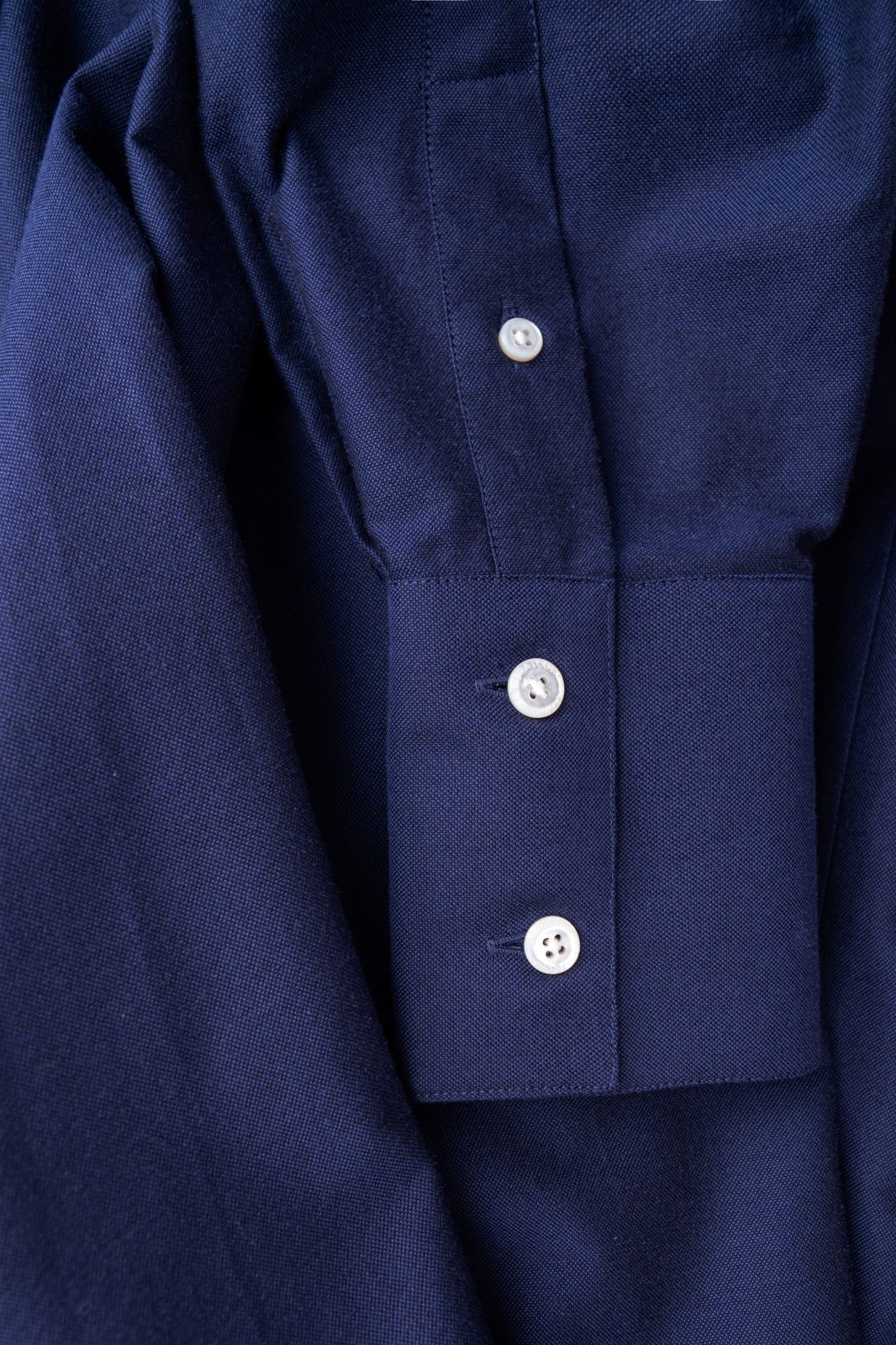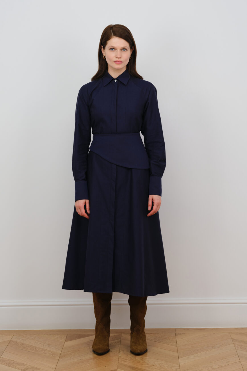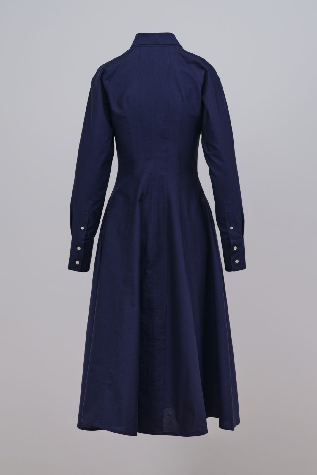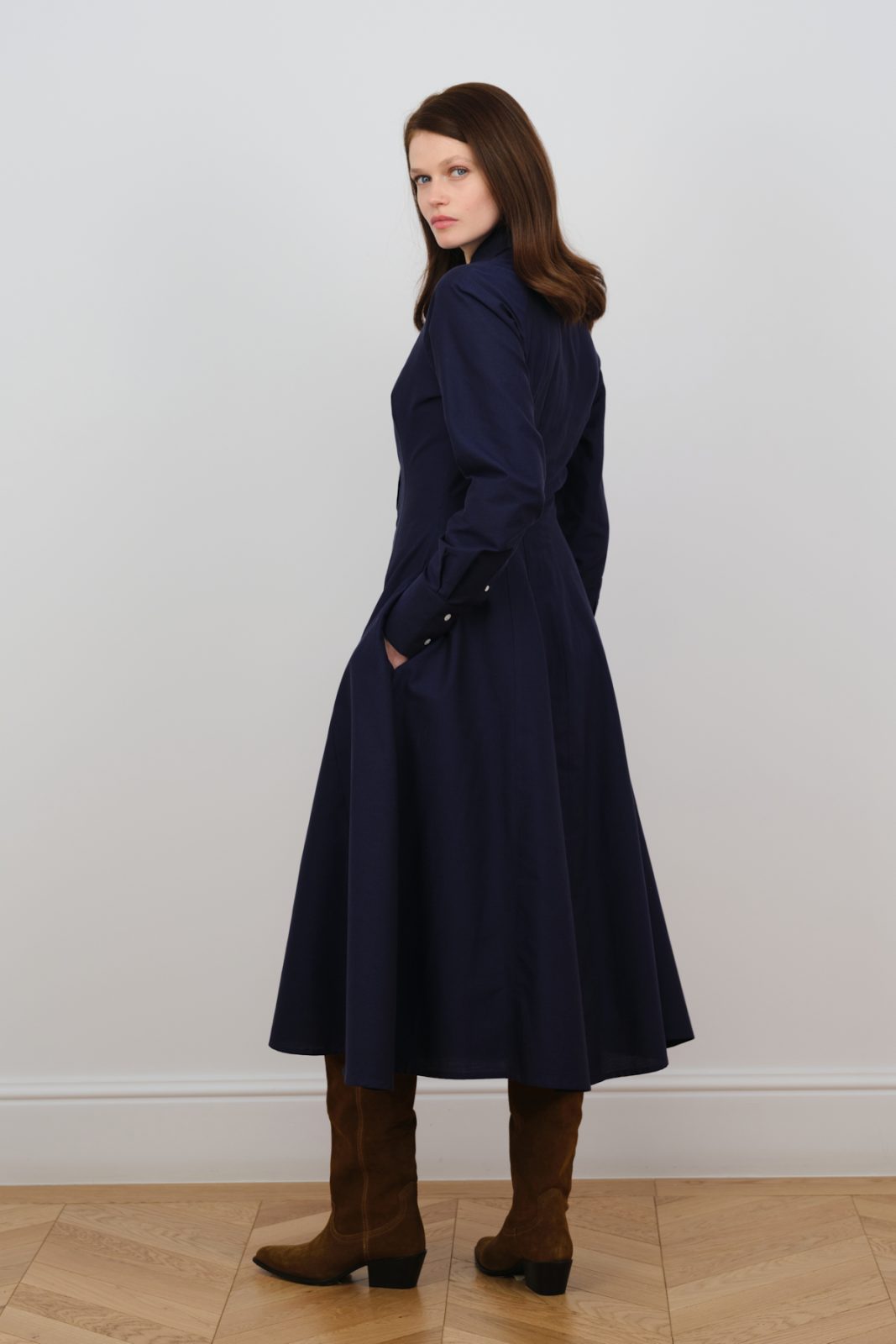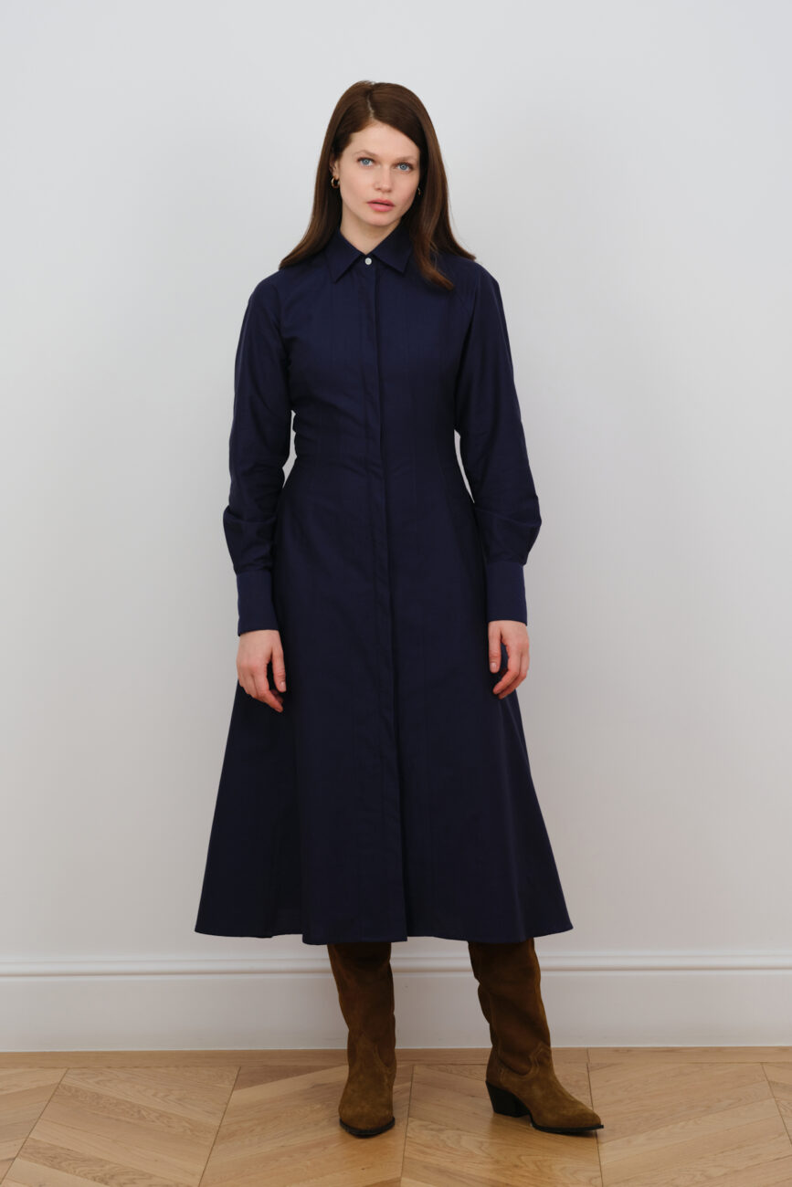 Rochie midi cambrata, cu clini laterali, fenta cu nasturi ascunsi, confectionata din tesatura de bumbac 100%, guler clasic, maneca lunga raglan si manseta lata cu doi nasturi.