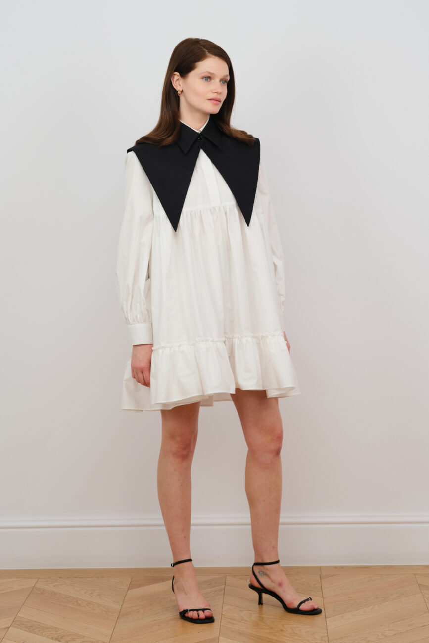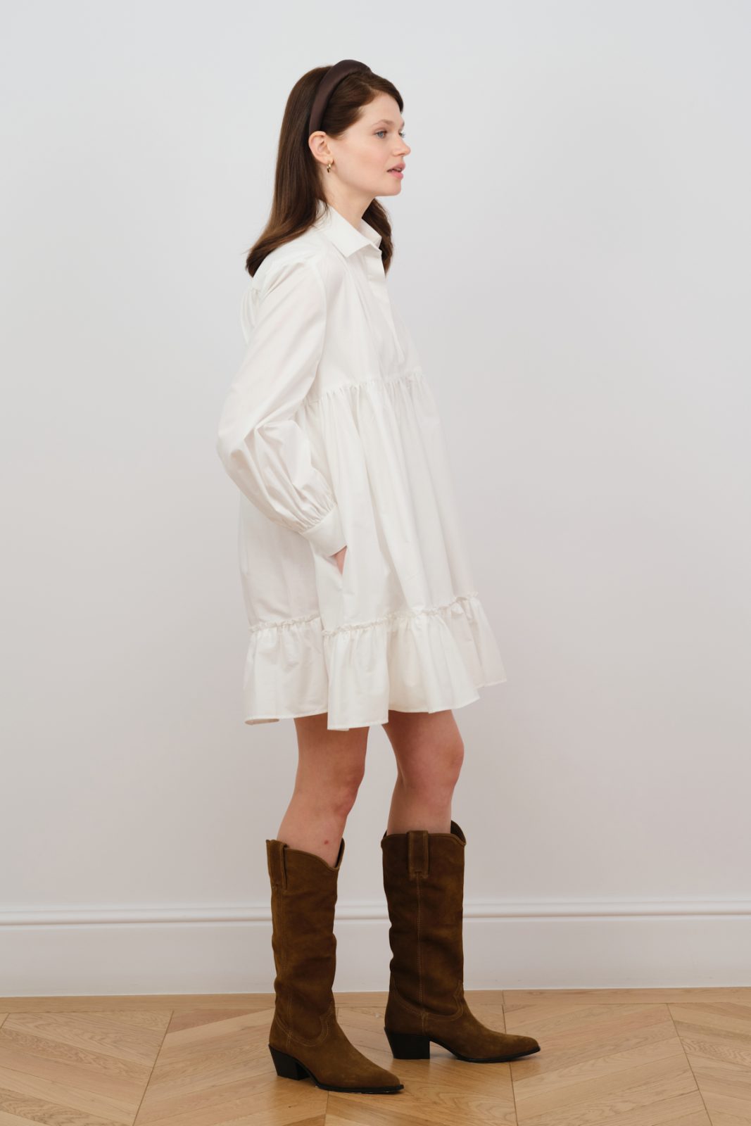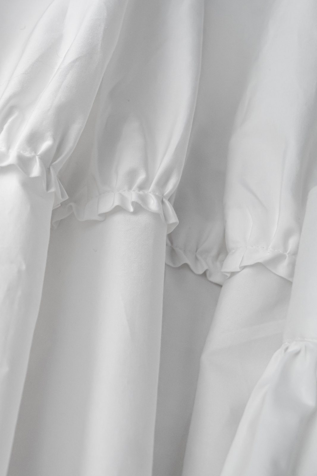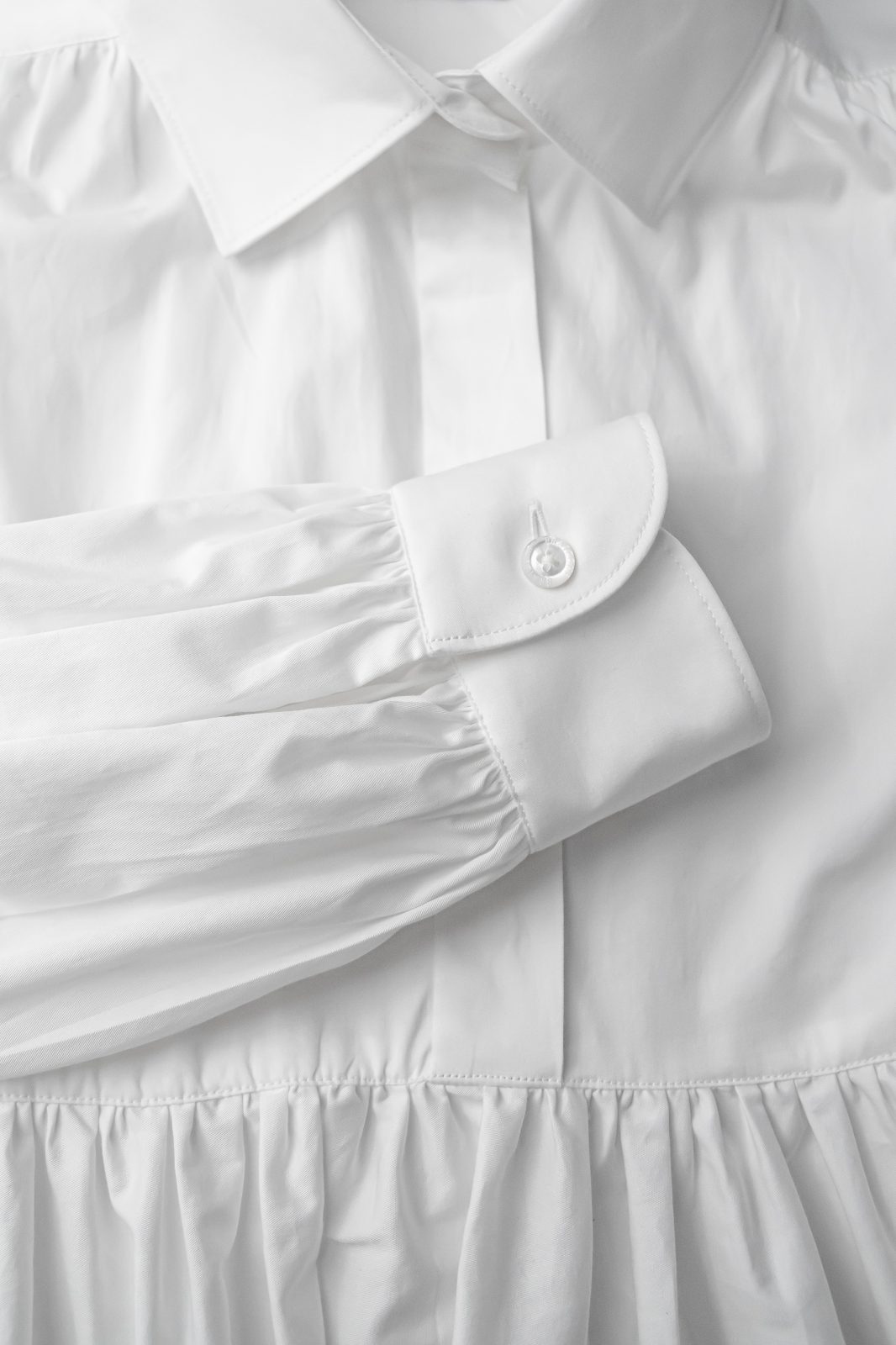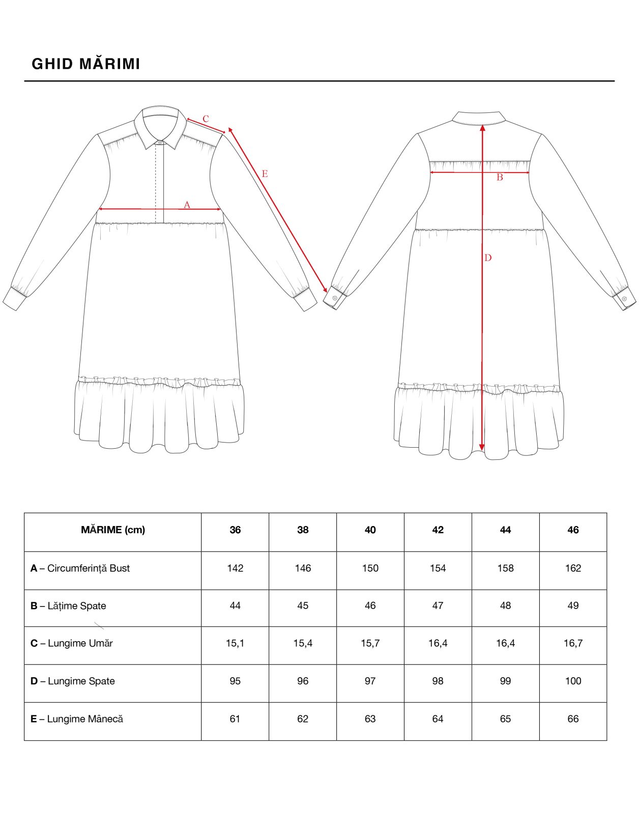 Rochie camasa larga, cu volane, platca incretita, fenta cu nasturi ascunsi, confectionata din tesatura de bumbac 100%, guler clasic, maneca lunga incretita la baza si manseta clasica cu un nasture.