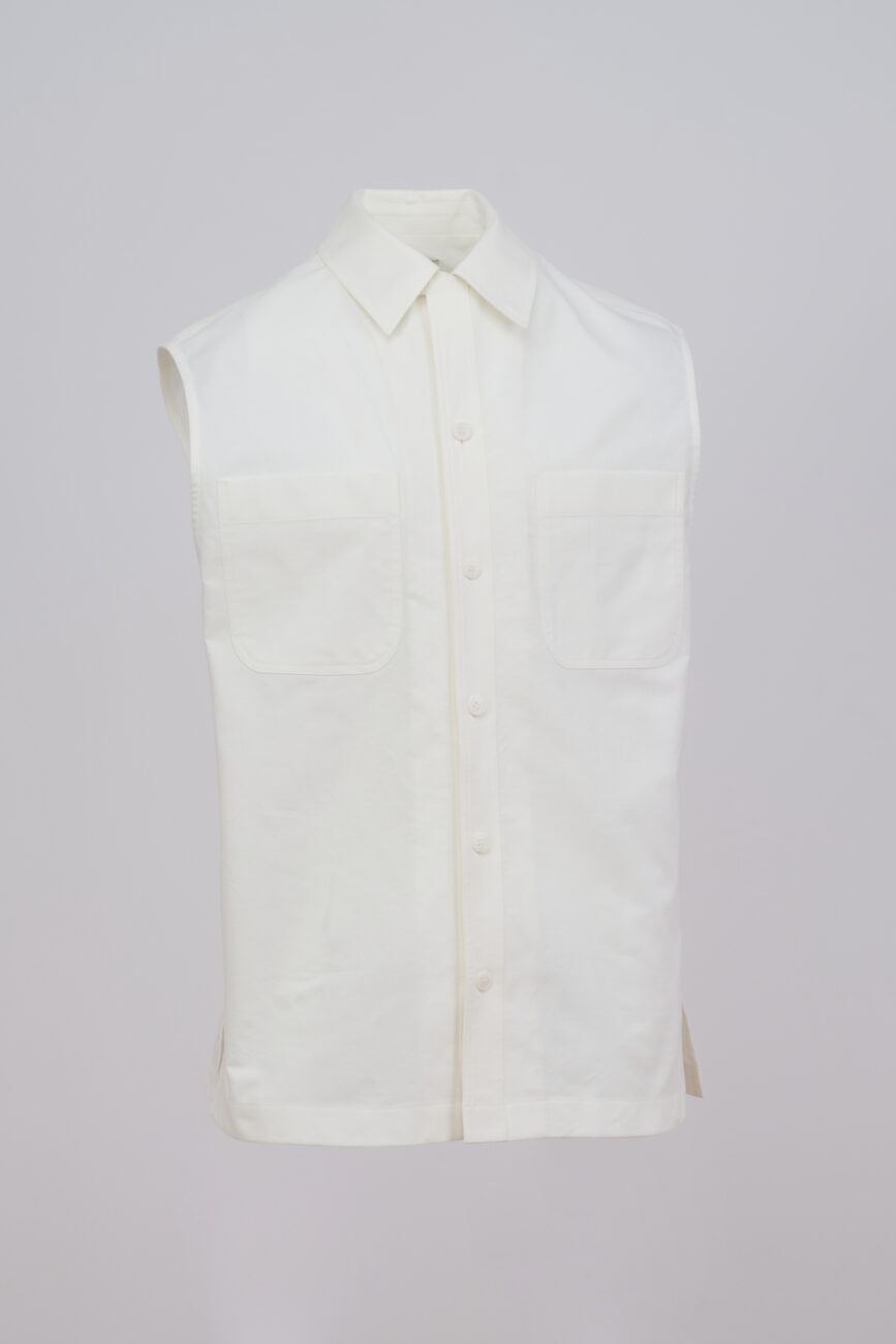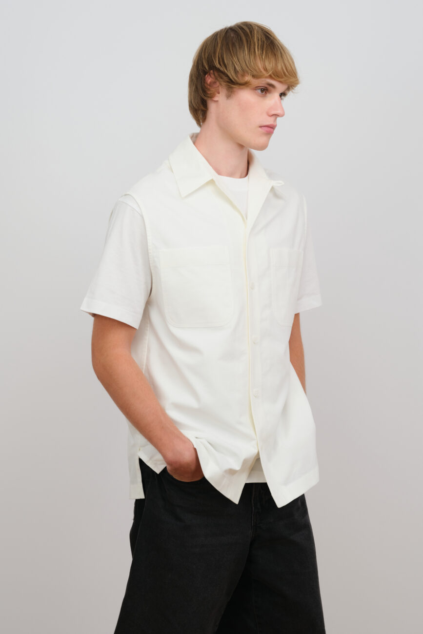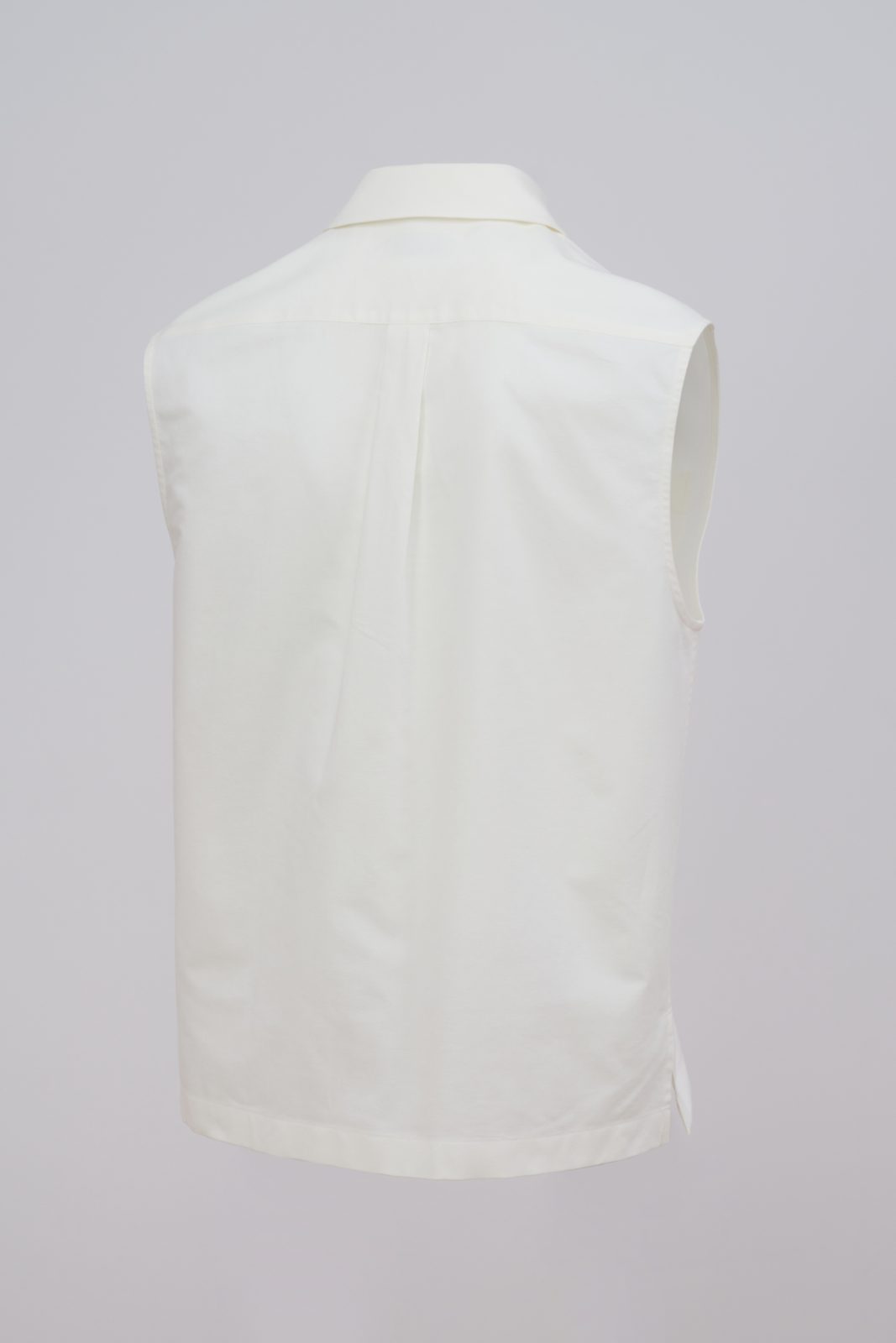 Vesta dreapta regular din tesatura de bumbac 100%, cu slituri laterale, guler clasic cu brida, inchidere cu nasturi, completata cu doua buzunare pe piept si pliu pe spate.
